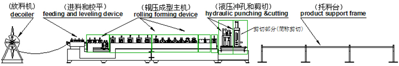 CZ 75-300快速可互换的辊式成型线由3T手动折叠器,进给引导装置,7个辊式调平装置,CZ快速可互换辊成型机,冲孔装置,切割装置,自动控制系统,液压系统组成。